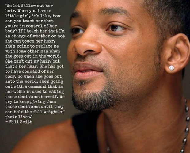 “We let Willow cut her hair. When you have a little girl, it’s like, how can you teach her that your in control of her body? If I teach her that I’m in charge of whether or not she can touch her hair, she’s going to replace me with some other man when she goes out into the world. She can’t cut my hair, but that’s her hair. She has got to have command over her body. So when she goes out into the world, she goes out with command that it’s hers. She is used to making those decisions herself. We try to keep giving them those decisions until they can hold the full weight of their lives.” -Will Smith