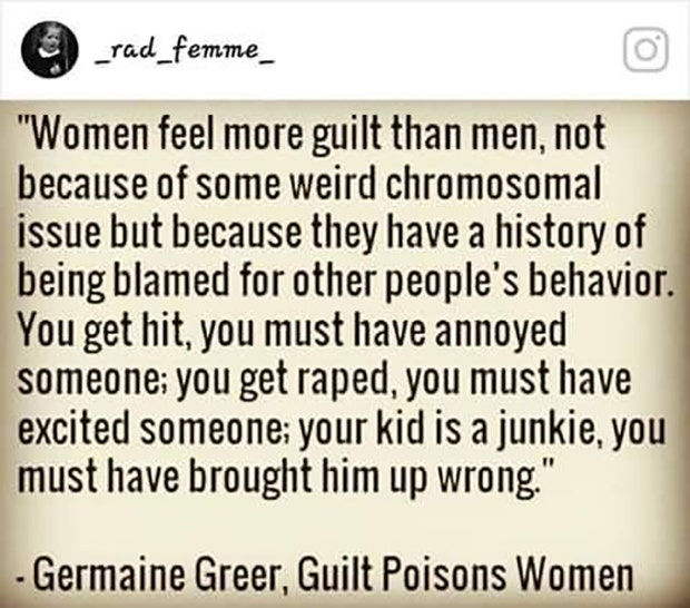 “Women feel more guilt than men, not because of some weird chromosomal issue but because they have a history of being blamed for other people’s behavior. You get hit, you must have annoyed someone; you get raped, you must have excited someone; your kid is a junkie, you must have brought them up wrong.” -Germaine Greer