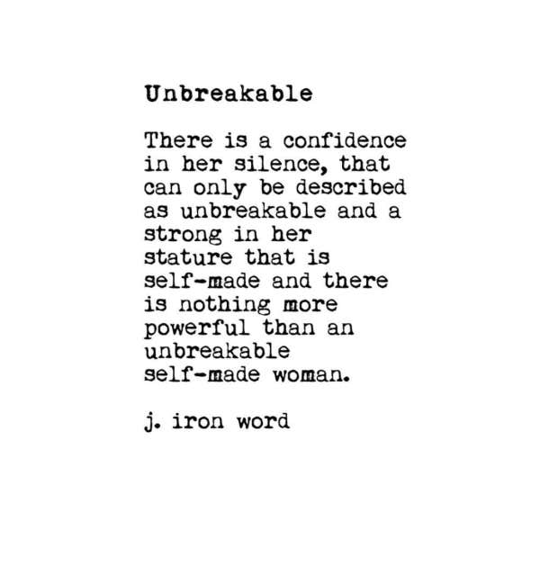 “There is a confidence in her silence, that can only be described as unbreakable and a strong in her stature that is self-made and there is nothing more powerful than an unbreakable self-made woman.”—J. Iron Word