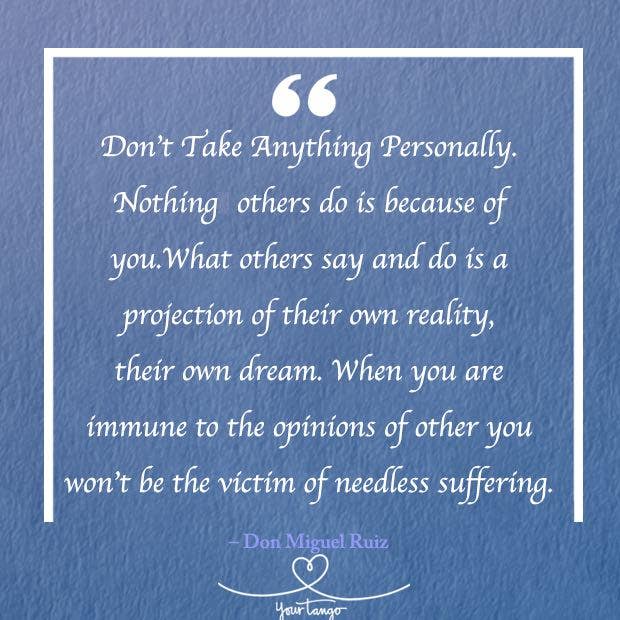 “Don’t Take Anything Personally. Nothing others do is because of you. What others say and do is a projection of their own reality, their own dream. When you are immune to the opinions of others, you won’t be the victim of needless suffering.” — Don Miguel Ruiz, The Four Agreements: A Practical Guide to Personal Freedom