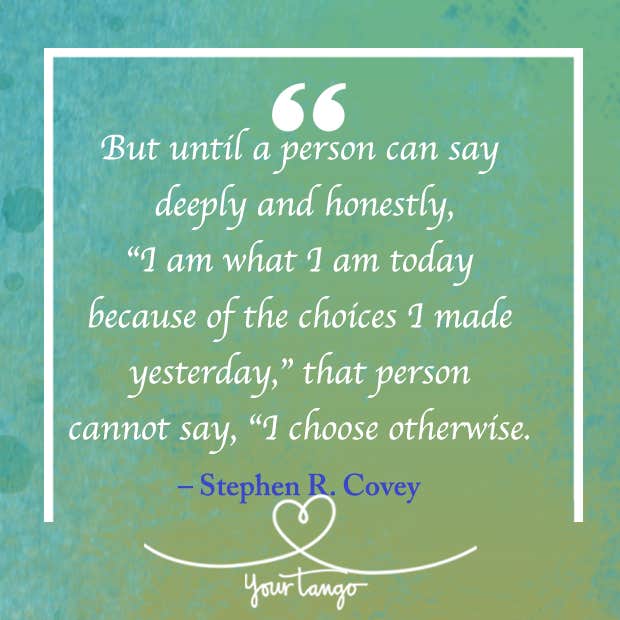 “But until a person can say deeply and honestly, “I am what I am today because of the choices I made yesterday,” that person cannot say, “I choose otherwise.” —Stephen R. Covey, The 7 Habits of Highly Effective People: Powerful Lessons in Personal Change