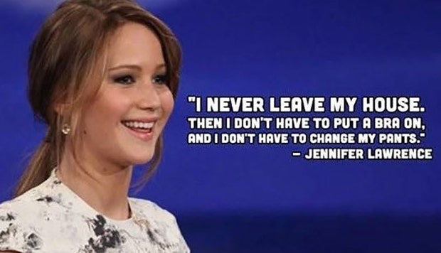 "I never leave my house. Then I don't have to put a bra on and I don't have to change my pants."- Jennifer Lawrence