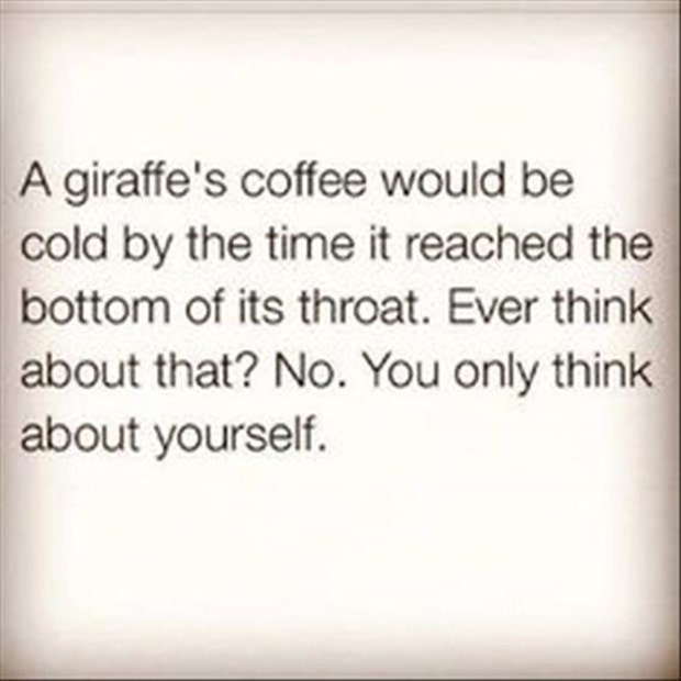 "A giraffe's coffee would be cold by the time it reaches the bottom of its throat. Ever think about that? No. You only think about yourself."- Anonymous