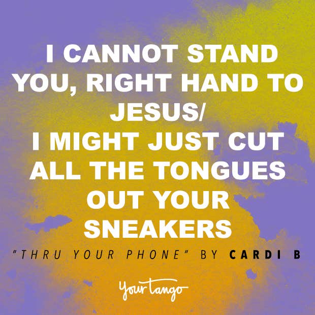 "I cannot stand you, right hand to Jesus/ I might just cut all the tongues out your sneakers." — Cardi B, "Thru Your Phone"