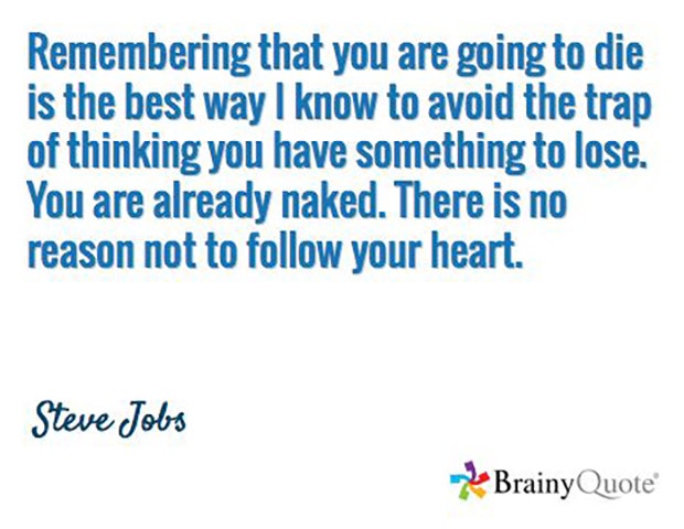 “Remembering that you are going to die is the best way I know to avoid the trap of thinking you have something to lose. You are already naked. There is no reason not to follow your heart.” — Steve Jobs