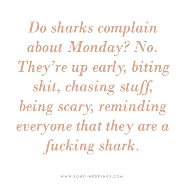 “Do sharks complain about Monday? No. They’re up early, biting sh*t, chasing stuff, being scary, reminding everyone that they are a f*cking shark.” — Unknown