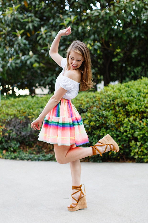 15. A bright skirt and white off-the-shoulder top is cute and festive.