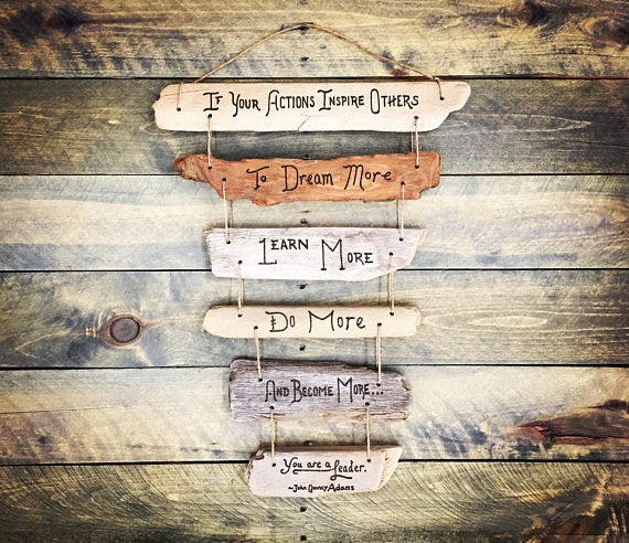 These lovely driftwood signs share motivational and inspirational messages, perfect for the corner office. Lofty ideals are inscribed on materials that are down to earth.