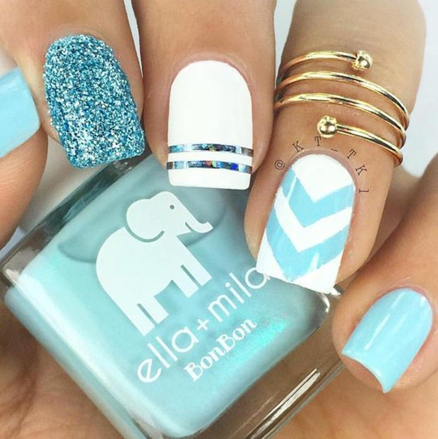 As an Aquarius, you are equal parts progressive and optimistic. A bright nail with your power color of blue will bring out your optimism. Since you are also progressive and independent, it's important to find a design that acknowledges that too. Instead of one design, you should use various ones on each nail. You're the ultimate hipster when it comes to nails, and doing things like everyone else isn't for you. Use this look for your ideal nails in the blue color scheme.