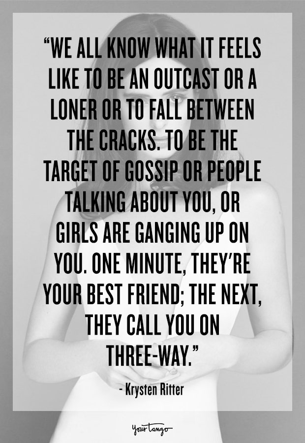 “We all know what it feels like to be an outcast or a loner or to fall between the cracks. To be the target of gossip or people talking about you, or girls are ganging up on you. One minute, they're your best friend; the next, they call you on three-way.” — Krysten Ritter
