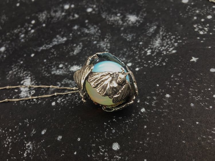 This piece is crafted from a North American Moth who passed of natural causes, casted in solid sterling silver. The orb within the sphere of moths is an Opalite stone, used as an open for your third eye (the locus of occult power and wisdom).