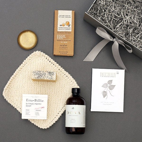Inspired by ancient Ayurvedic wisdom, this curated gift box is filled with delicious, healing ingredients for inner and outer wellbeing. They’ve paired turmeric-infused edibles with handcrafted and organic food-inspired skincare and wrap everything together in a presentation-worthy pearl silver gift box and bow.
