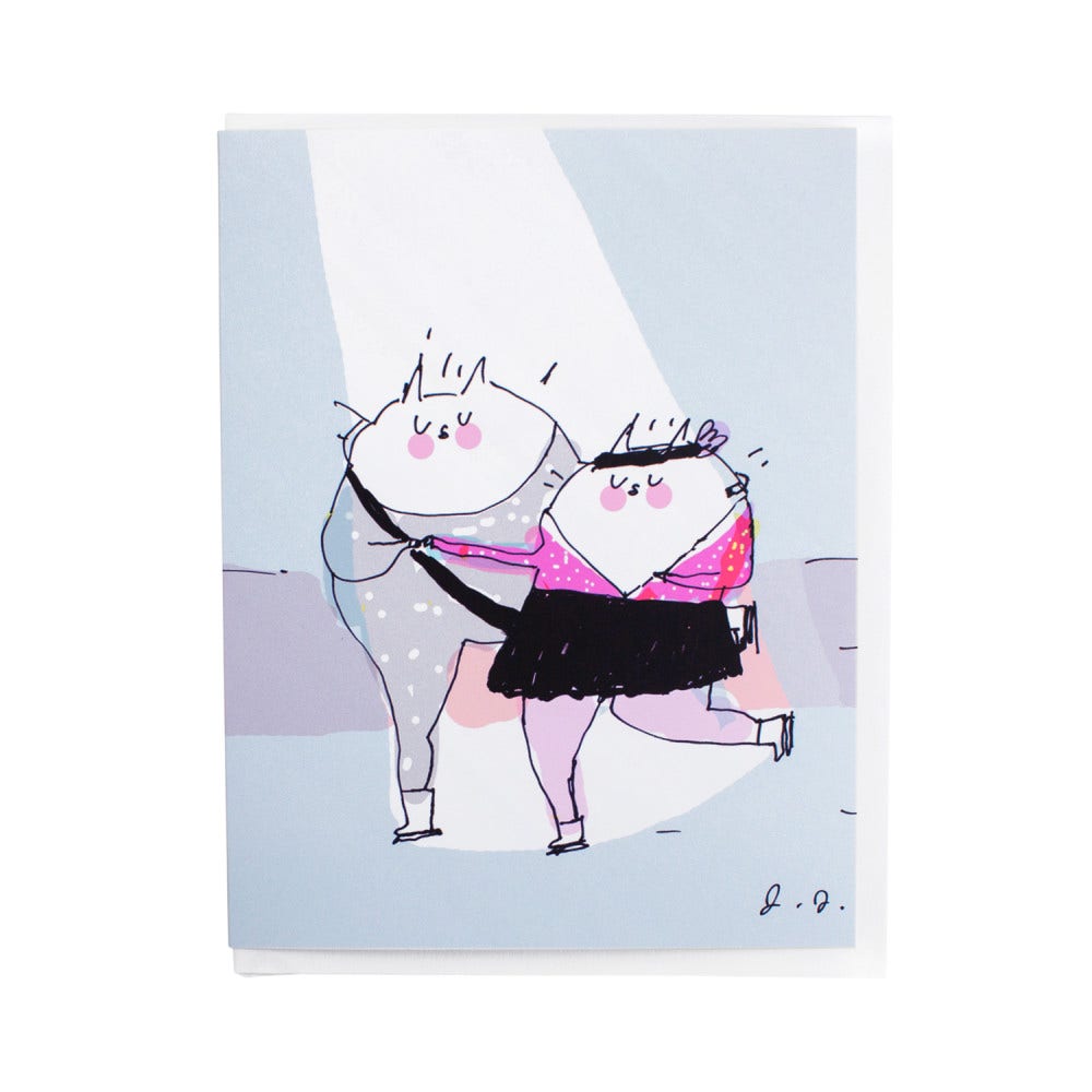 This card, which is blank inside so you can put your own special message, showcases a couple of graceful and loverly kittens, skating off into the sunset together. How sweet!