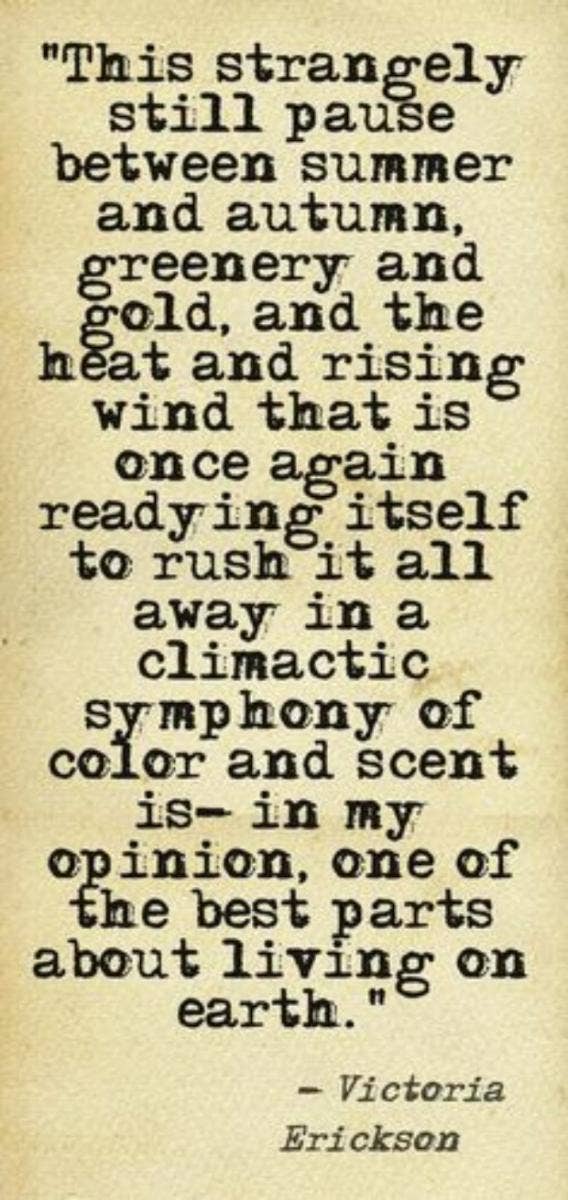 “This strangely still pause between summer and autumn, greenery and gold, and the heat and rising wind that is once again readying itself to rush it all away in a climactic symphony of color and scent is ~ in my opinion, one of the best parts of living on earth." -Victoria Erikson