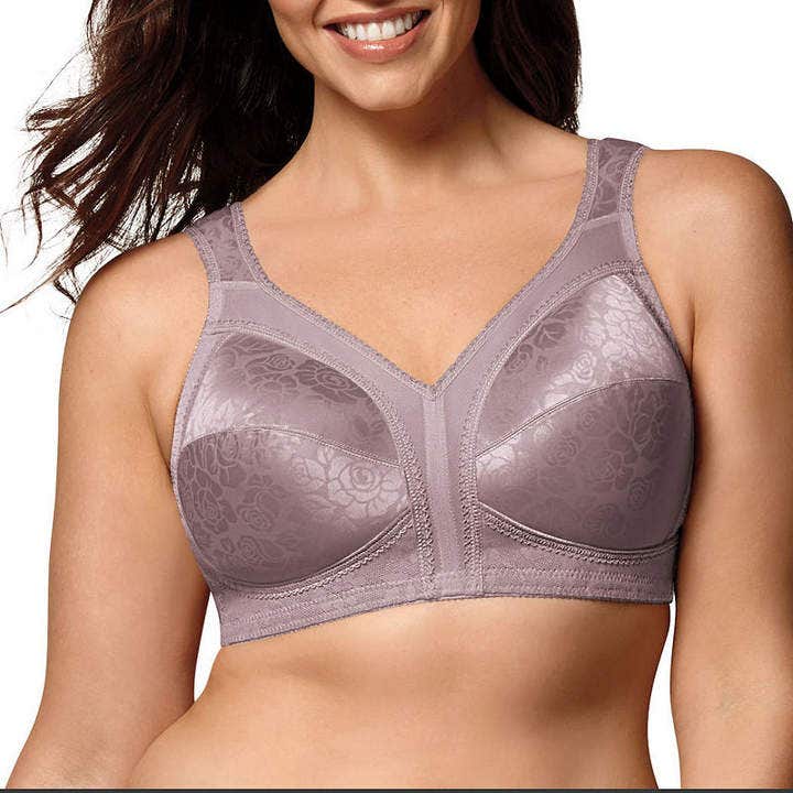 This full-figure bra has soft moisture wicking bottom cups with side smoothing shape and wide cushioned shoulder straps and a hidden, cushioned comfort band that cradles the bust so the wire never touches your body.