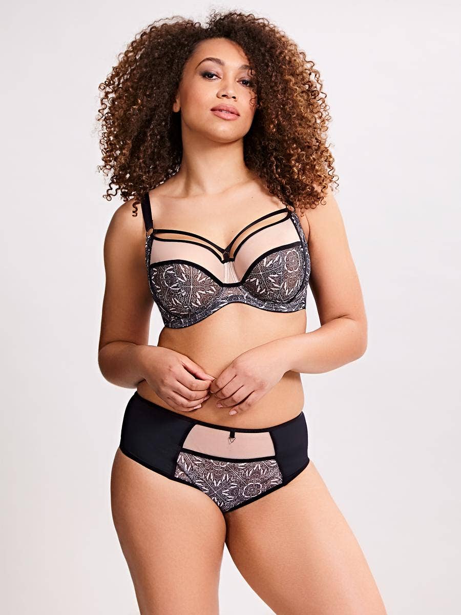 From the designers behind Panache (known to be the leader in bras in D+ cup sizes) Sculptresse is a “sister brand” that’s specifically designed for plus-sizes AND larger cup sizes. Band sizes run from 36-46, and this bra goes up to an HH. This bra has a multi-part underwire cup with a mesh lining, and subtle diamond print.