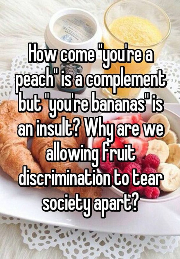 "How come 'you're a peach' is a compliment but 'you're bananas' is an insult? Why are we allowing fruit discrimination to tear society apart?" — unknown