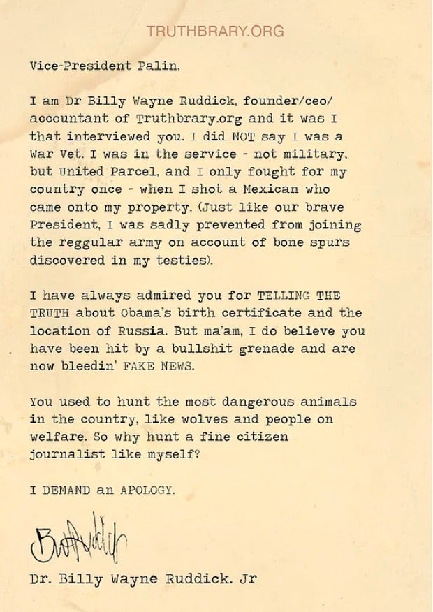 In a letter typed on Truthbrary station, Ruddick demanded an apology from Palin, stating for the record that it was him, not Baron Cohen, who interviewed her, and that he never claimed to be a war veteran, but rather a veteran of the United Parcel Service.