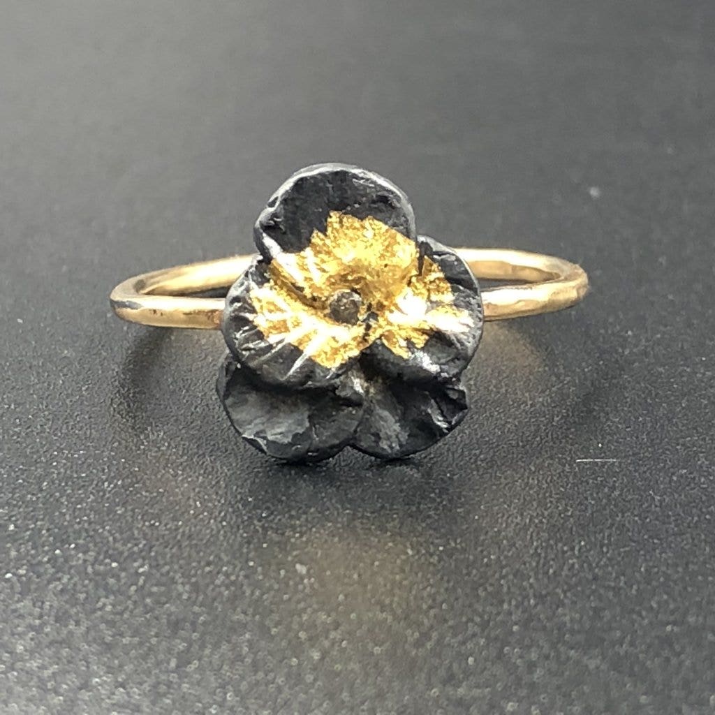 A small pansy (1/2 inch in length) made from oxidized sterling silver, 24 karat gold, and a center diamond adorns a 14k gold band in size 7. Handmade in Minnesota, USA.