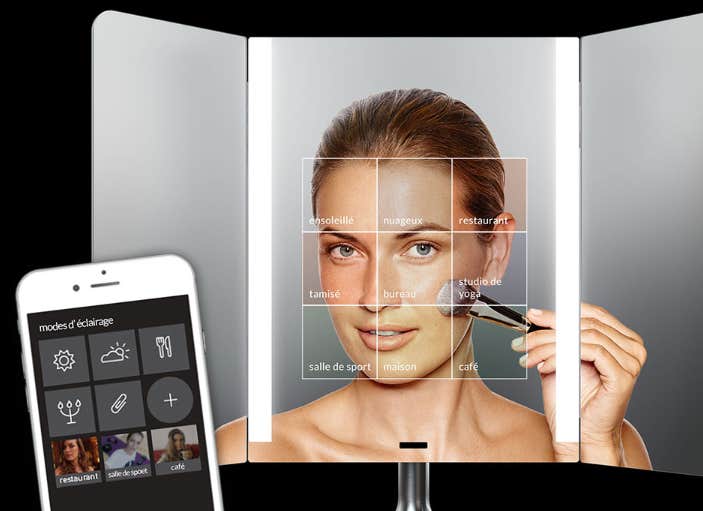 This mirror has a wide viewing area with side panels that fold in so you can see yourself from almost every angle, plus a 10x magnification detail mirror for close up work. Its tru-lux light system closely simulates natural sunlight’s full color spectrum to show every detail. It has over 50,000 color variations and you can use your phone to choose presets and capture light settings from the environment around you and recreate them in the mirror.
