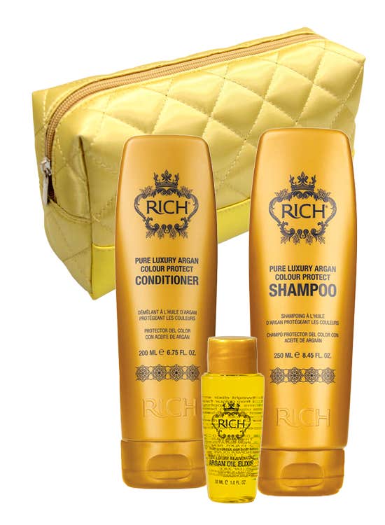 Protect your hair with the best Argan Oil enriched haircare set perfect for colored hair which includes RICH Rejuvenating Argan Oil Elixir, Argan Color Protect Shampoo and Conditioner, all Enriched with Omega 6 and 9 to help rebuild and moisturized hair. The best idea for hair is to have a hair system designed to work together rather than fitting together individual items from different sets.