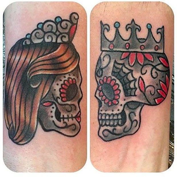This couple opted for a royal spin on their sugar skull tattoos.