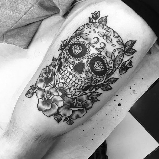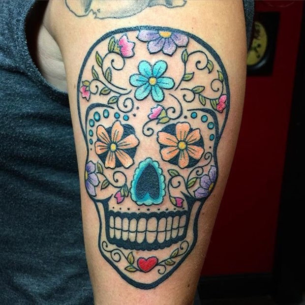 17. A sugar skull tattoo fits nicely onto a shoulder.
