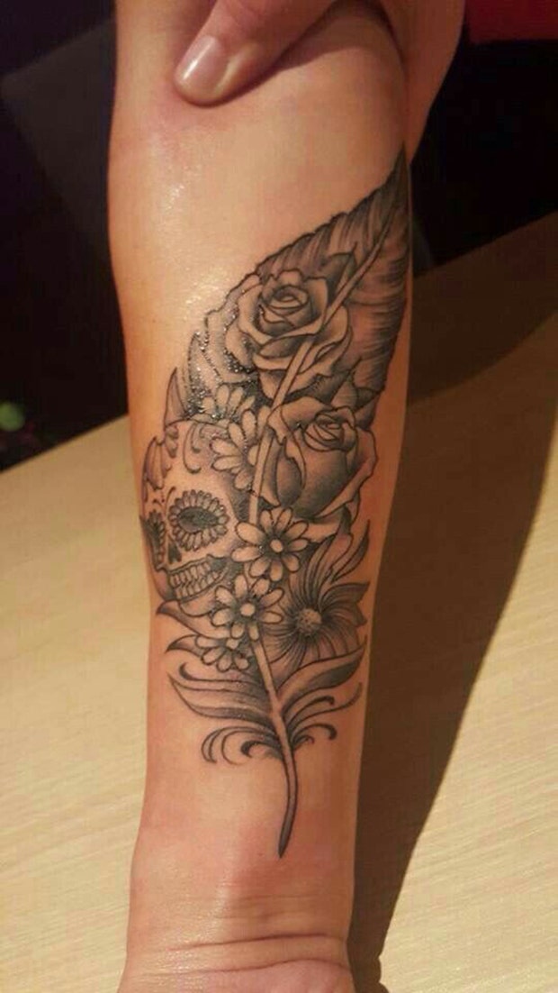 25. Feather tattoos are pretty popular. Make yours unique by incorporating a sugar skull.