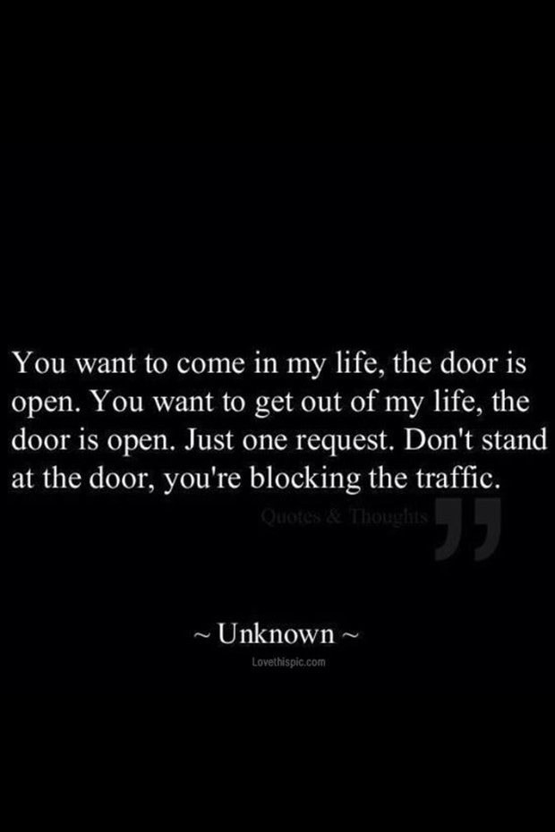 "You want to come in my life, the door is open. You want to get out of my life, the door is open. Just one request. Don't stand at the door, you're blocking the traffic." — unknown