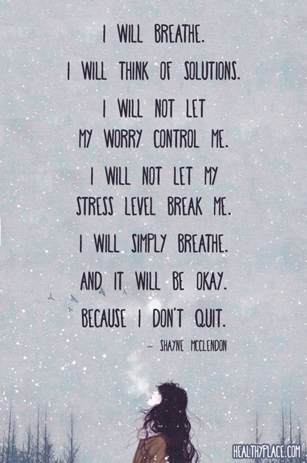 "I will breathe. I will think of solutions. I will not let my worry control me. I will not let my stress level break me. I will simply breathe. And it will be okay. Because I don't quit."—Unknown