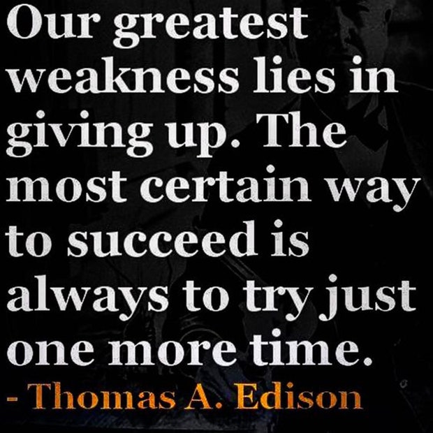 "Our greatest weakness lies in giving up. The most certain way to succeed is always to try just one more time."—Thomas A. Edison