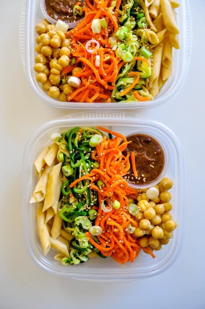 Once the pasta is ready, serve it next to the chickpeas and spirals in containers for the week.