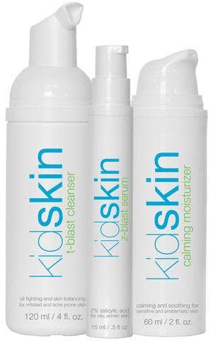The Kidskin 3-step acne kit consists of T-blast foaming cleanser, Z-blast clarifying serum, and a calming moisturizer. The cleanser features tea tree oil that will kill bacteria, fungus, and infections. Salicylic acid in the serum will reduce redness and inflammation, and the white tea leaf extract in the moisturizer will help soothe the skin and clear imperfections.