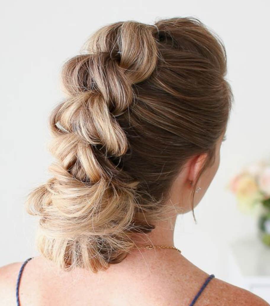 This French braid is absolutely stunning. All this takes is a Dutch braid and then pulled out to its max and tied in a low bun. This look is perfect for any upcoming holiday parties or a big office event.