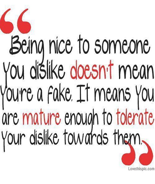 "Being nice to someone doesn't mean you're a fake. It means you are mature enough to tolerate your dislike towards them". — Unknown