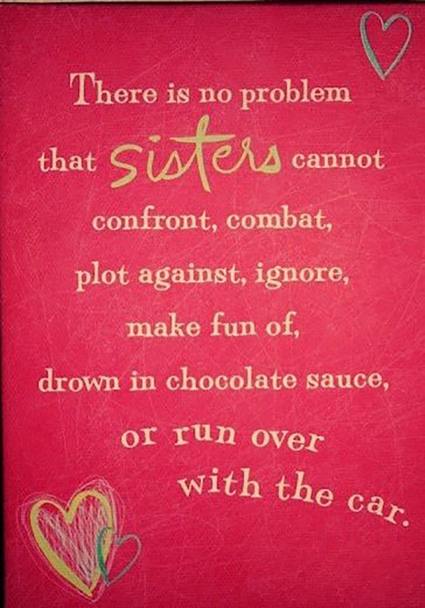 “There is no problem that sisters cannot confront, combat, plot against, ignore, make fun of, drown in chocolate sauce, or run over with the car.” —​ Unknown