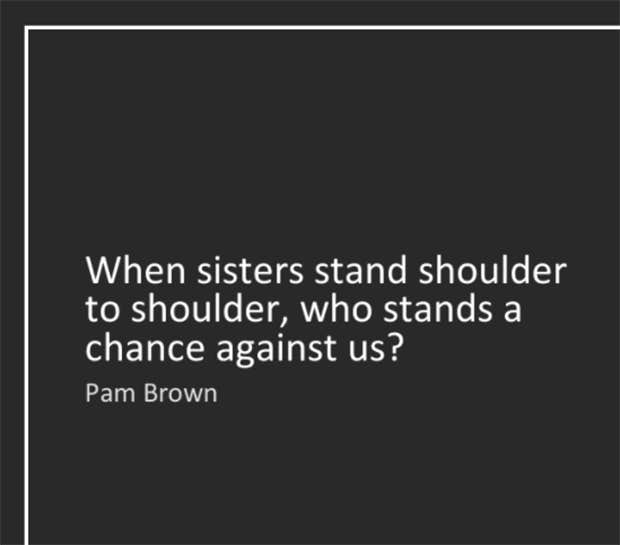 “When sisters stand shoulder to shoulder, who stands a chance against us?”— Pam Brown