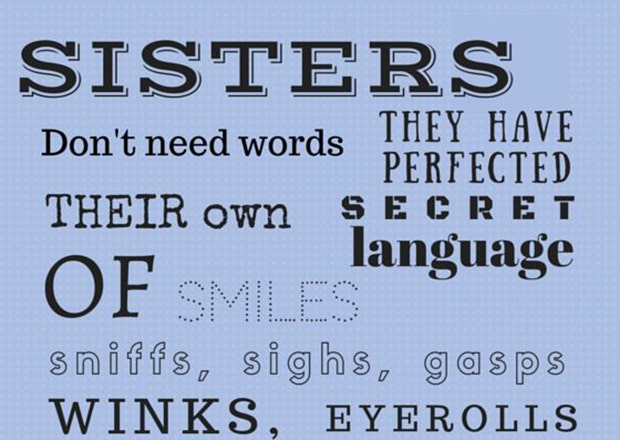 “Sisters don’t need words. They have perfected their own secret language of smiles, sniffs, sighs, gasps, winks and eye rolls.”— Unknown
