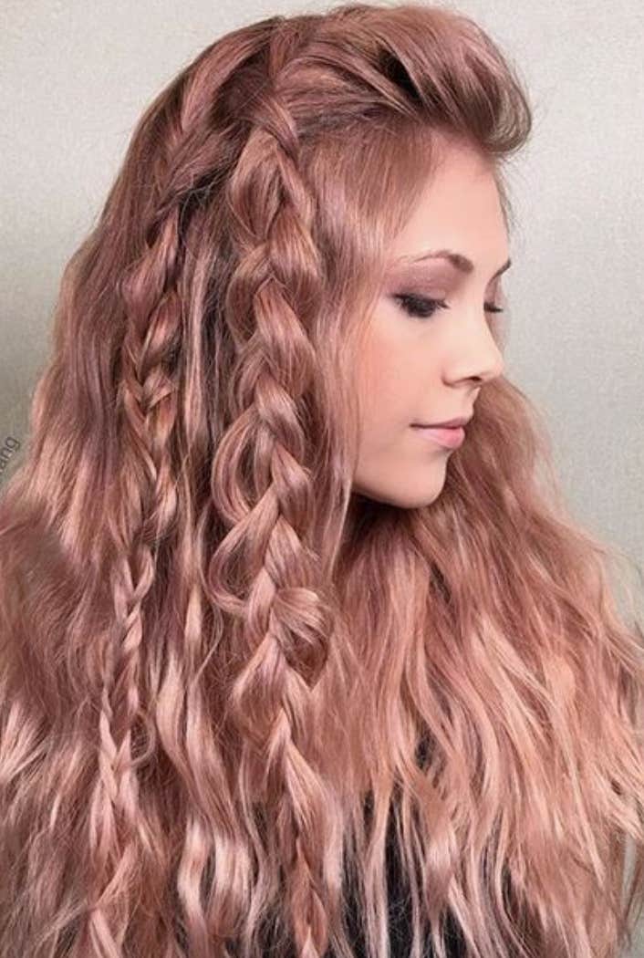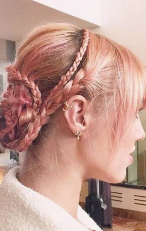 These messy braids were made for rose gold hair. They mix in perfectly with this wind-blown look.