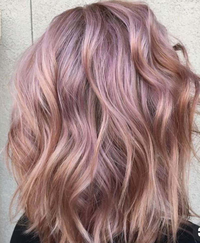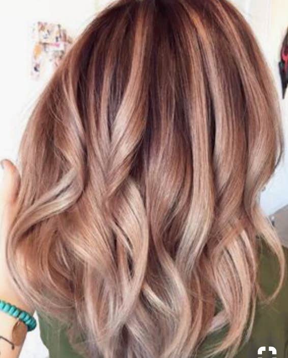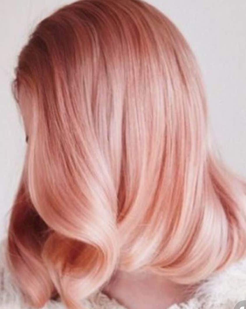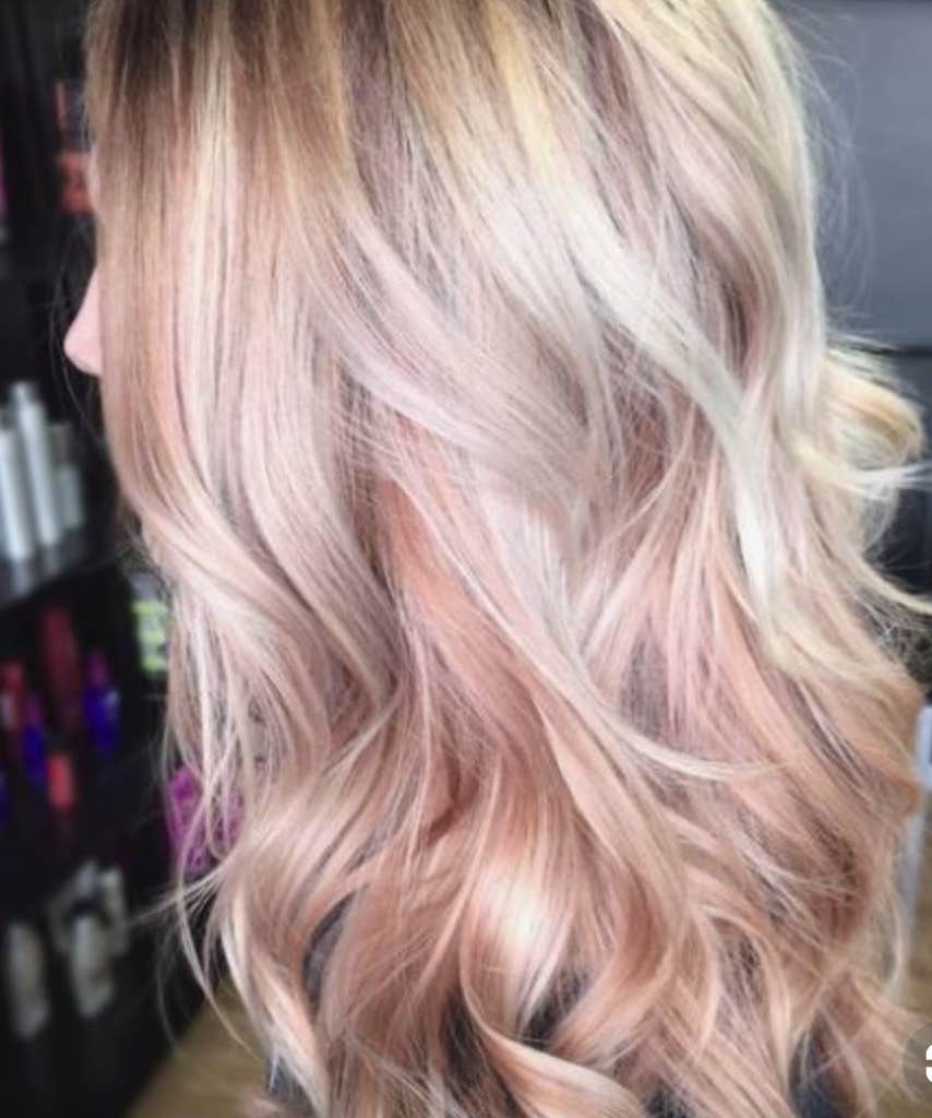 Perfect for a light blonde looking to go all rose gold. This look features an effortless root to end shade.