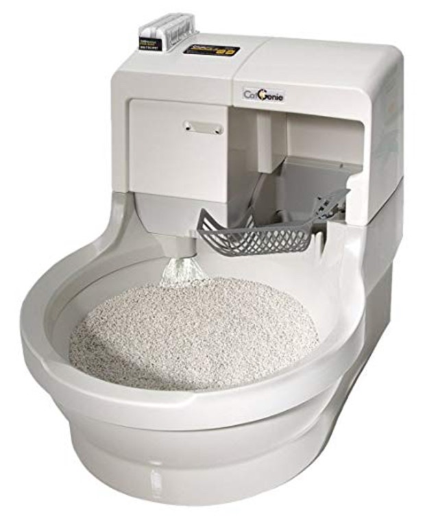 Automatic cat box flushes waste away and washes itself clean and uses litter-like Washable Granules not clay litter to satisfy cats need to dig and cover.