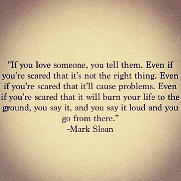 "If you love someone, you tell them. Even if you're scared that it's not the right thing.Even if you're scared that it'll cause problems. Even if you're scared that it will burn your life to the ground, you say it, and you say it loud and go from there." — Mark Sloan, Grey's Anatomy