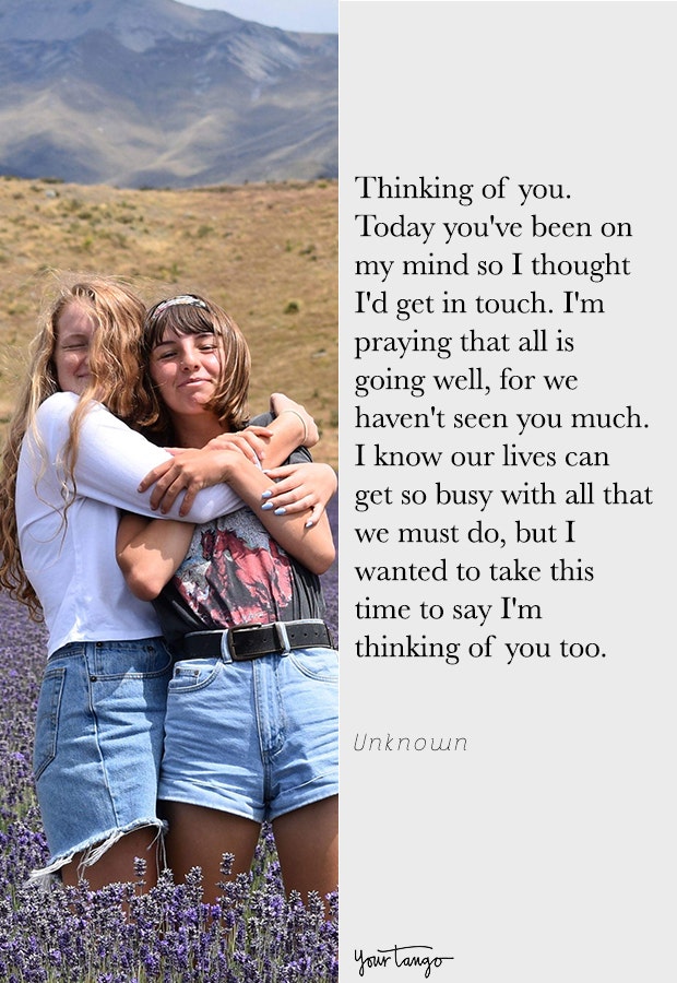 "Thinking of you. Today you've been on my mind so I thought I'd get i touch. I'm praying that all is going well for we haven't seen you much. I know our lives can get so busy with all that we must do, but I wanted to take this time to say I'm thinking of you too." — Unknown