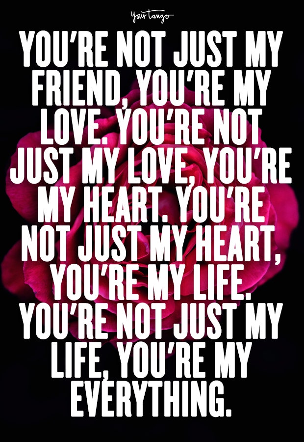 "You're not just my friend, you're my love. You're not just my love, you're my heart. You're not just my heart, you're my life. You're not just my life, you're my everything." — Unknown