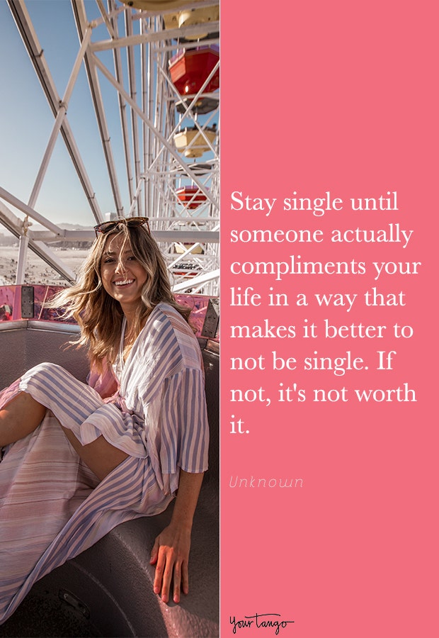 "Stay single until someone actually compliments your life in a way that makes it better to not be single. If not, it's not worth it." — Unknown