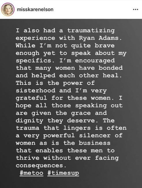 In a now-deleted post on Instagram, Elson wrote, “I also had a traumatizing experience with Ryan Adams. While I’m not quite brave enough yet to speak about my specifics, I'm encouraged that many women have bonded and helped each other heal. This is the power of sisterhood and I’m very grateful for these women. I hope all those speaking out are given the grace and dignity they deserve. The trauma that lingers is often a very powerful silencer of women, as is the business that enables these men to thrive without ever facing consequences.”