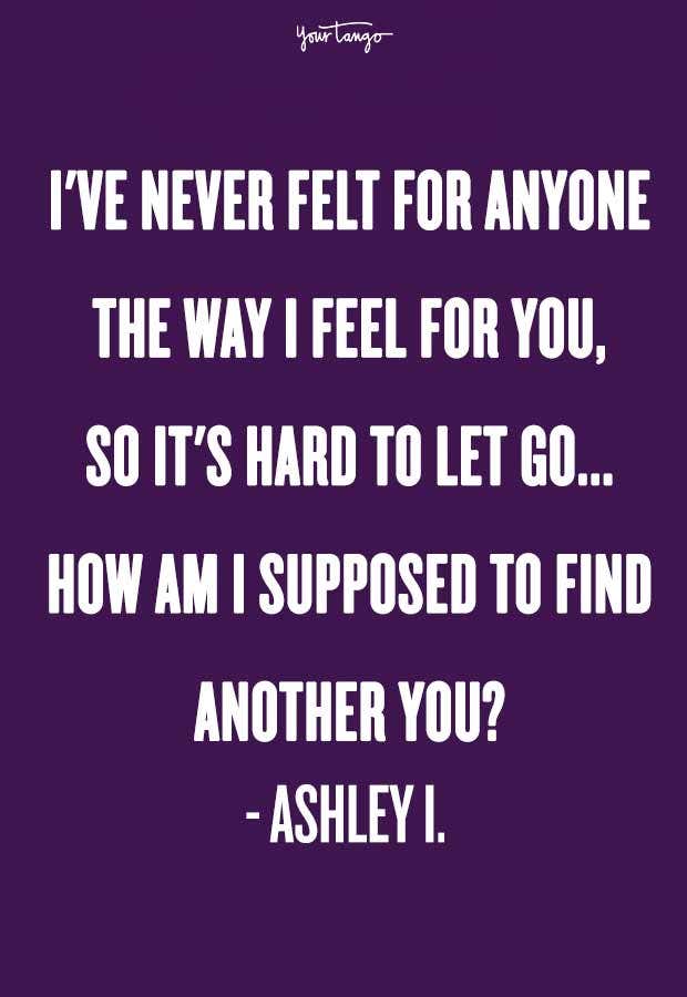 "I've never felt for anyone the way I feel for you, so it's hard to let go... How am I supposed to find another you?" — Ashley I.