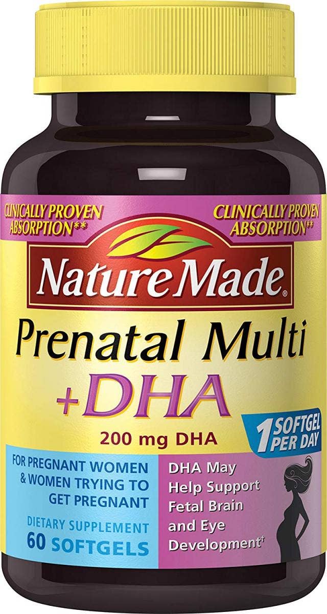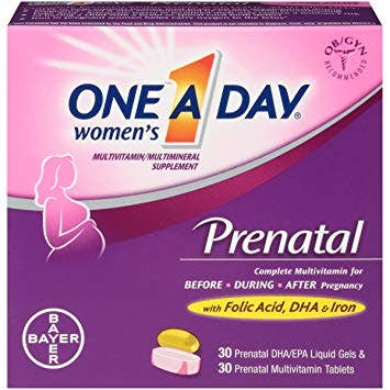 This two pill formula contains folic acid, omega-3 DHA, calcium, vitamins A, B6, B12, C, D, and E, iron, thiamin, riboflavin, niacin, Biotin, iodine, magnesium, copper, pantothenic acid, and zinc. DHA is an omega-3 fatty acid that can help support healthy fetal brain and eye development during pregnancy. "A prenatal I like to recommend is One A Day Women's Prenatal Multivitamins, but pregnant women should talk with their healthcare provider about their own specific nutritional needs before deciding," says Dr. Landry.