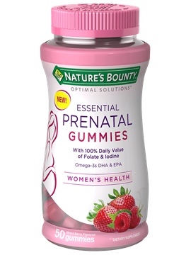 Nature’s Bounty Essential Prenatal Gummies are the most delicious way to support your health before, during and after pregnancy. The delicious, mixed berry-flavored gummies contain 13 key nutrients, including 100 percent daily value of iodine and folic acid, and 51 mg of omega-3s EPA and DHA per 2 gummy serving.