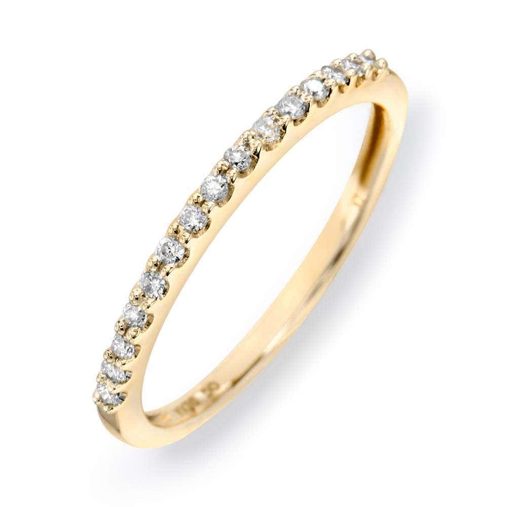 This solid 14K gold thin promise ring is made up of tiny stackable rings with round-shape diamond stones in a beautiful prong setting. These dainty bands can be worn alone or later paired with an engagement piece.